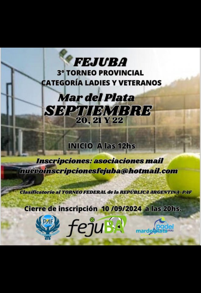 »» Evento: 3er PROVINCIAL LADIES y VETERANOS - FEJUBA 2024 »» Localidad: Mar del Plata »» Fechas: 20/09/2024 al 22/09/2024